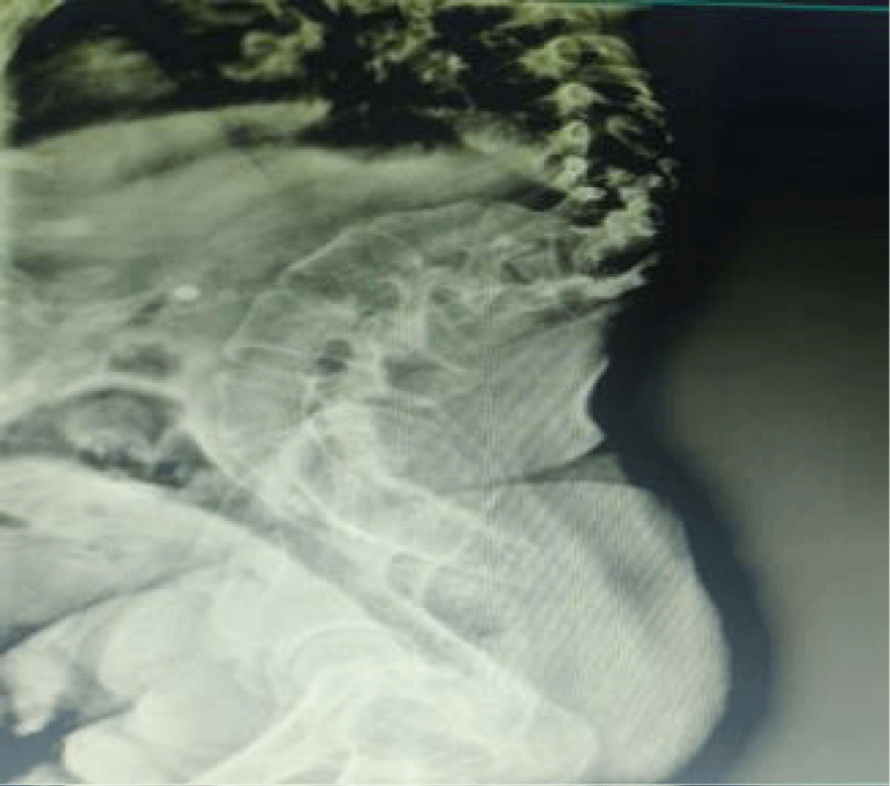 Figure 1: Lateral standing Lateral X-ray of the spine showing severe thoracolumbar kyphoscoliosis.